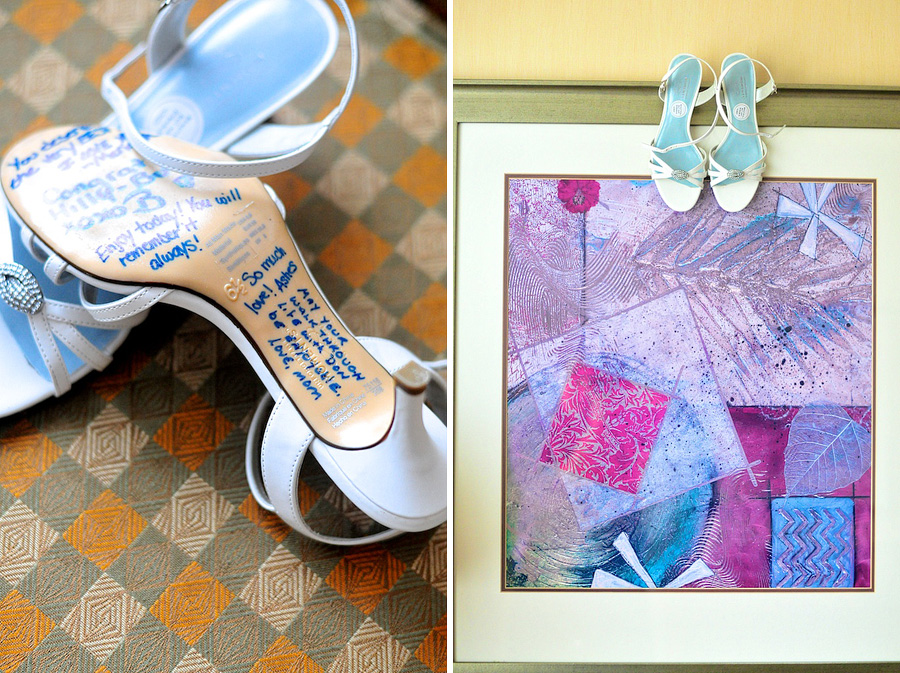 Hilary’s bridesmaids signed the bottom of her shoes as her “something blue”. 🙂
